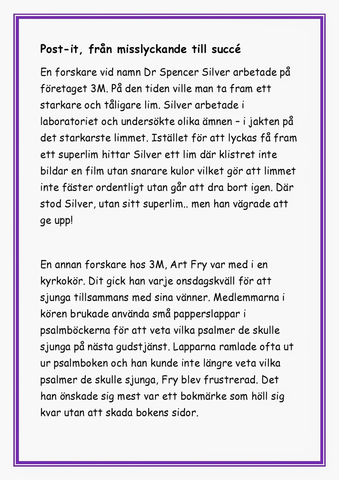 Kamratrespons och måluppfyllelse kändes långt bort – i det klimatet var kunskapsinhämtningen begränsad.Vi har fått arbeta aktivt med att skaffa ett klimat där misslyckande är accepterat och ses som en del av lärandet. Jag funderade länge på hur jag skulle introducera detta för eleverna, hur skulle jag få dem att inte bara förstå utan också få känslan av att misslyckande verkligen är accepterat och en del av lärandet? Jag ville ge dem ett konkret exempel på misstag som lett till framgång. Jag tittade på post-it lapparna som används så flitigt i dagens skola…